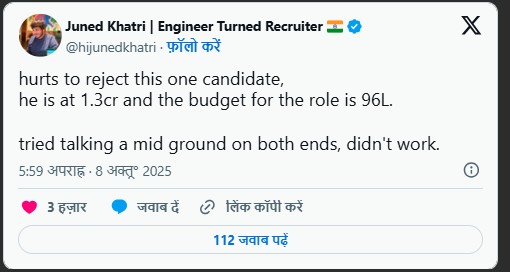 ان کے مطابق وہ ایک معروف مگر نامعلوم کمپنی میں ہیڈ آف انجینئرنگ کے عہدے کے لیے بھرتی کر رہے تھے۔ کمپنی ایسے امیدوار کی تلاش میں تھی جس کے پاس کم از کم 17 سال کا تجربہ ہو۔ لیکن جب امیدوار کو 96 لاکھ روپے سالانہ کا آفر دیا گیا تو اس نے صاف انکار کرتے ہوئے کہا کہ اسے 1.3 کروڑ روپے کی فکس تنخواہ قبول ہوگی۔